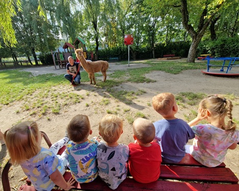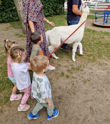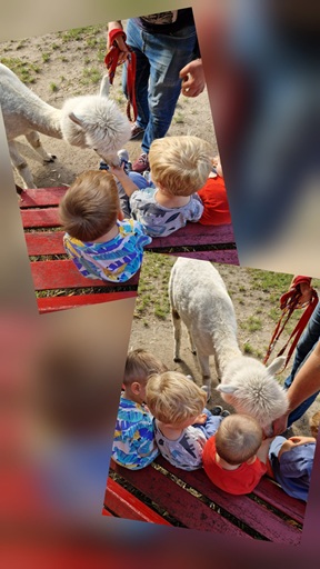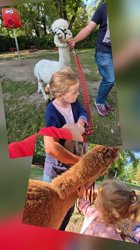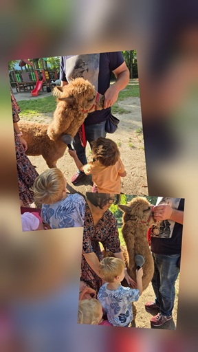 Nasze dzielne maluchy miały wyjątkowych towarzyszy spaceru – alpaki-Kiki i AliBabę.Dzieci nie tylko wyprowadziły je na spacer, ale też karmiły, głaskały i czesały te puszyste zwierzęta. Niektóre dzieci na początku patrzyły z dystansem… bo alpaka z bliska to nie żart! Ale strach został pokonany.