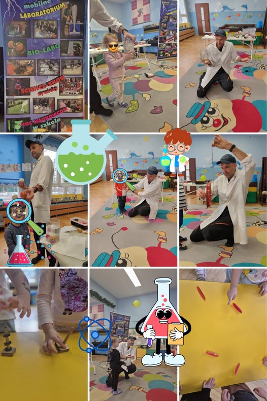 W styczniowy piątek dzieci uczestniczyły w warsztatach Mobilnego Laboratorium. Podczas zajęć obserwowały doświadczenia z powietrzem oraz z wodą we wszystkich stanach skupienia. Następnie brały udział w aktywnościach z wykorzystaniem magnesów i spinnerów.